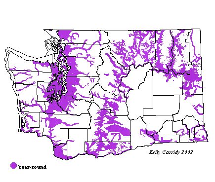 Black-capped Chickadees are very common year round in the Puget Trough. They are also common and widespread in eastern Washington, especially along lowland streams. They are generally replaced by the other Washington chickadees at higher altitudes. They are found higher up on the western slopes of the Cascades than on the eastern slopes. They are uncommon but increasing on the Olympic Peninsula, where they did not occur until recently. Black-cappeds can be found in developed areas and towns on the peninsula, but are not as common there as Chestnut-backed Chickadees.