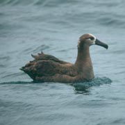A pelagic bird, usually seen only from boats, the Black-footed Albatross is solid brownish-gray, with a pale face and a lighter patch at the base of its tail. It is unusual in that it is a dark albatross; most other albatrosses are predominantly white. The Black-footed Albatross is relatively small for an albatross, but it is a very large, long-winged bird nonetheless.