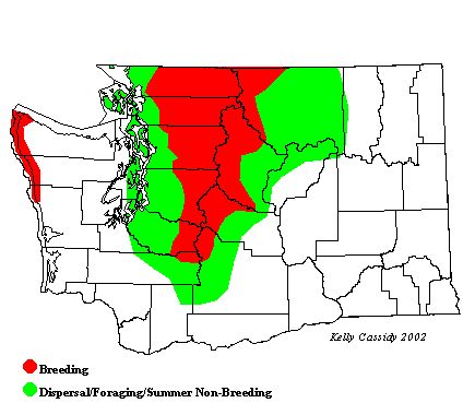 The Black Swift is an uncommon breeder in forested habitats at moderate elevations in the northern Cascades (both east and west sides north of Snoqualmie Pass) and possibly along the rocky coastline from Point Grenville (Grays Harbor County) to Cape Flattery (Clallam County). It may well breed in the other mountain ranges in the state, although this is undocumented. The long distances Black Swifts travel to forage and the obscurity of their nests make it difficult to ascertain where they are nesting. During the breeding season, Black Swifts have been sighted as far south as Mount Adams and into the Puget Sound lowlands, including the San Juan Islands, and east as far as Ferry County. Look for them around lowland fresh water in June on overcast mornings, when they are driven from the clouded-in mountains.