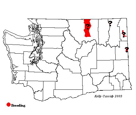 The first recorded Clay-colored Sparrow in Washington was near Spokane (Spokane County) in 1960. Between 1964 and 1986 there was evidence of breeding at that location during at least eight seasons, and between 1994 and 1996, one or two breeding pairs were found each year, sometimes with fledglings. The Clay-colored Sparrow is a rare and local breeder east of Spokane. While Spokane is the only area with confirmed breeding, Clay-colored Sparrows are also found in a few scattered places in the northern part of the state, in Okanogan and Ferry Counties. There is one breeding-season record in western Washington, from 1995 in Olympia (Thurston County). Fall and winter sightings (mostly winter) in western Washington are becoming more common, with one or two birds seen each year with flocks of White-crowned and Golden-crowned Sparrows.