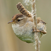 The Marsh Wren is usually not seen for long, as it pops up from dense emergent vegetation, only to duck back out of sight moments later. Small and stocky, with the classic wren tail held upright, the Marsh Wren is easily identified as a wren. The upperparts are brown with a black patch streaked with white, and the tail is barred with black. In Washington populations, the shoulders are brown, unmottled, and much duller colored than those of Marsh Wrens in eastern North America. The belly is gray-brown, lighter than above. The throat is light, and the white eye-line and brown crown are field marks to note.