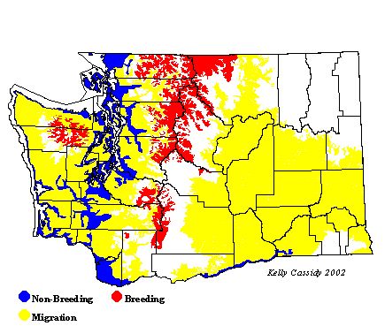 American Pipits are present in Washington as breeders, migrants, and wintering birds. They are common breeders at high elevations in the Olympics and North Cascades, and at major volcanic mountains in the southern Cascades. In the Olympics, they are most common in the wetter, western alpine areas. They are common from Mount Baker to Harts Pass (Whatcom County), and on Mount Adams, Mount Rainier, and Mount St. Helens. They are common migrants in open habitats throughout the state from mid-April to early May, and then again from early September to mid-November. Small numbers winter in western Washington, and can be found in fallow fields or open, disturbed areas, and on beaches. A few wintering birds can rarely be found in the river valleys and lake basins of eastern Washington.