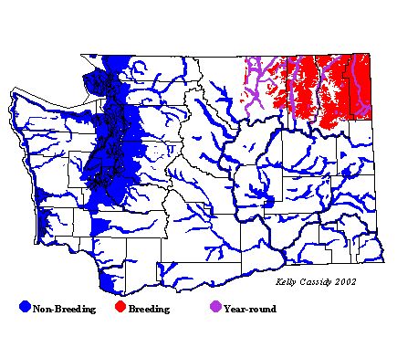 Common Goldeneyes are among the least common breeding ducks in Washington, found nesting only in the northeastern portion of the state, with most birds nesting in north-central and northeastern Canada. From November to April, however, Common Goldeneyes are fairly common on both fresh water and calm salt water in both the eastern and western lowlands. It is one of the most common wintering diving ducks throughout much of Puget Sound, and can be found in large concentrations in the sound and along the Columbia and Snake Rivers.