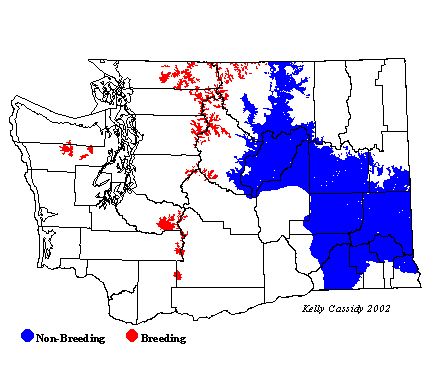 Because their habitat is largely inaccessible, Gray-crowned Rosy-Finches are hard to find in the breeding season. They occur from mid-April to mid-October above 6,500 feet in the Olympics and above 6,000 feet in the Cascades. In the Olympics they are limited to the highest peaks, including Mount Olympus, Mount Carrie, The Needles, Mount Deception, and Mount Anderson. In the Cascades, they are most common north of Snoqualmie Pass, although they also breed on Mount Rainier, Mount Adams, and in the Goat Rocks Wilderness Area. Before the 1980 eruption they also bred on Mount St. Helens. From late October to mid-May, they are most often found east of the Cascades, especially at Grand Coulee and Moses Coulee. They are sometimes seen on gravel along roadsides. Their numbers can vary considerably from year to year, but they are always considered uncommon or rare. During migration they may be found along the barren ridges of the shrub-steppe zone, or gathering into pre-migration flocks in mountainous areas. Look for them during this time at Sunrise on Mount Rainier. They are also occasionally found in the lowlands of western Washington during migration and in winter.