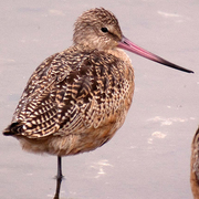 Marbled Godwits are most likely to be seen in protected estuaries along the outer coast, from Grays Harbor south, from April to early May, and from July into October. Birds seen later in the fall, from September to October, are usually juveniles. Large flocks often feed on the golf course in Ocean Shores (Grays Harbor County) in the spring. A flock also winters regularly at Tokeland in Willapa Bay (Pacific County). Other possible sites are Blaine (Whatcom County) and Sequim (Clallam County).