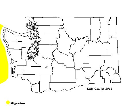 Most records for Sabine's Gulls are offshore, and pelagic birding trips give birders the best chance of spotting them. However, juveniles and adults can both be found inland, and sightings, though rare, are so regular in fall that a small percentage of the population must use an overland migration route. The best time of the year to look for Sabine's Gulls is during migration, when they are common on the open water--May for spring migration and the second half of August and September for fall migration. They are uncommon in June and July, and in October, and very rare or absent the rest of the year. They are occasionally blown towards shore in storms and can sometimes be found in the Strait of Juan de Fuca. Juvenile birds are found inland rarely on both sides of the Cascades.