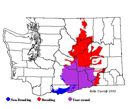 A few wintering birds can be found in most years in the Columbia River bottoms east to the Tri-Cities area, and occasionally but rarely in western Washington. They are mostly summer visitors, however, and are usually common in eastern Washington from mid-March to mid-September. They commonly nest at Hanford (Benton County), at the Yakima Training Center and Toppenish National Wildlife Refuge (Yakima County), along the Colville Plateau and east of Tonasket (Okanogan County), as well as in other areas of appropriate habitat in eastern Washington. The Loggerhead Shrike is rarely seen in Washington during the winter.