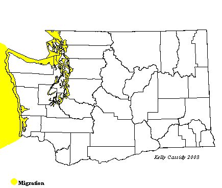 Migrants occur off Washington from August to November and April to June. The spring migration is shorter and less pronounced than fall. In the Pacific, Parasitic Jaegers winter at sea from southern California to southern Chile and Australia. They often migrate near the coast, but also farther at sea and over land. They breed from western Arctic Alaska and the Aleutian Islands to north-central Canada and Greenland. Migrants usually travel singly or in small groups, and they may come close to shore to steal food from gulls and terns.